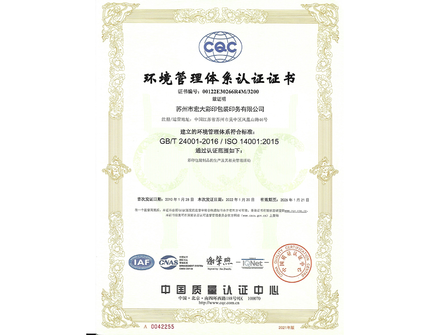 環境管(guan)理體系(xì)認證證(zhèng)書