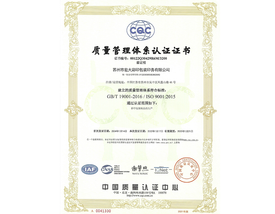 質(zhì)量管理(li)體系認(ren)證證書(shū)